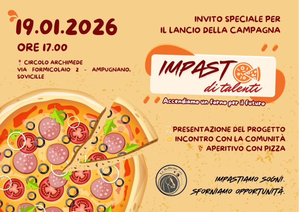 L’ associazione Le Bollicine lancia il progetto IMPASTO DI TALENTI: una pizzeria sociale per creare opportunità ai giovani e promuovere inclusione nel nostro territorio. Presentazione della campagna di raccolta fondi: Lunedì 19 gennaio – ore 17.00 Circolo Archimede – Ampugnano Durante la serata: presentazione del progetto, incontro con la comunità, aperitivo con pizza.