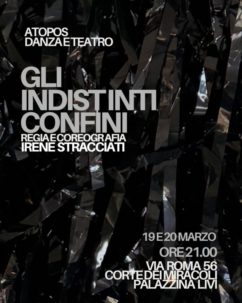 Gli Indistinti Confini, dalle Metamorfosi di Ovidio, indaga la soglia dell’essere e dello sparire, non come opposizione ma come zona di intensità. Il nero dominante non è assenza di luce ma condizione originaria, grembo e abisso. La metamorfosi non è evento ma stato permanente. Le coreografie, sono attraversate da immagini fisse, improvvise: il tempo presente contiene l’agire e lo svanire. Una riflessione sulla forza della natura e l’impermanenza della forma: l’essere si afferma proprio nel momento in cui perde definizione, e il presente contiene in sé tutte le metamorfosi.